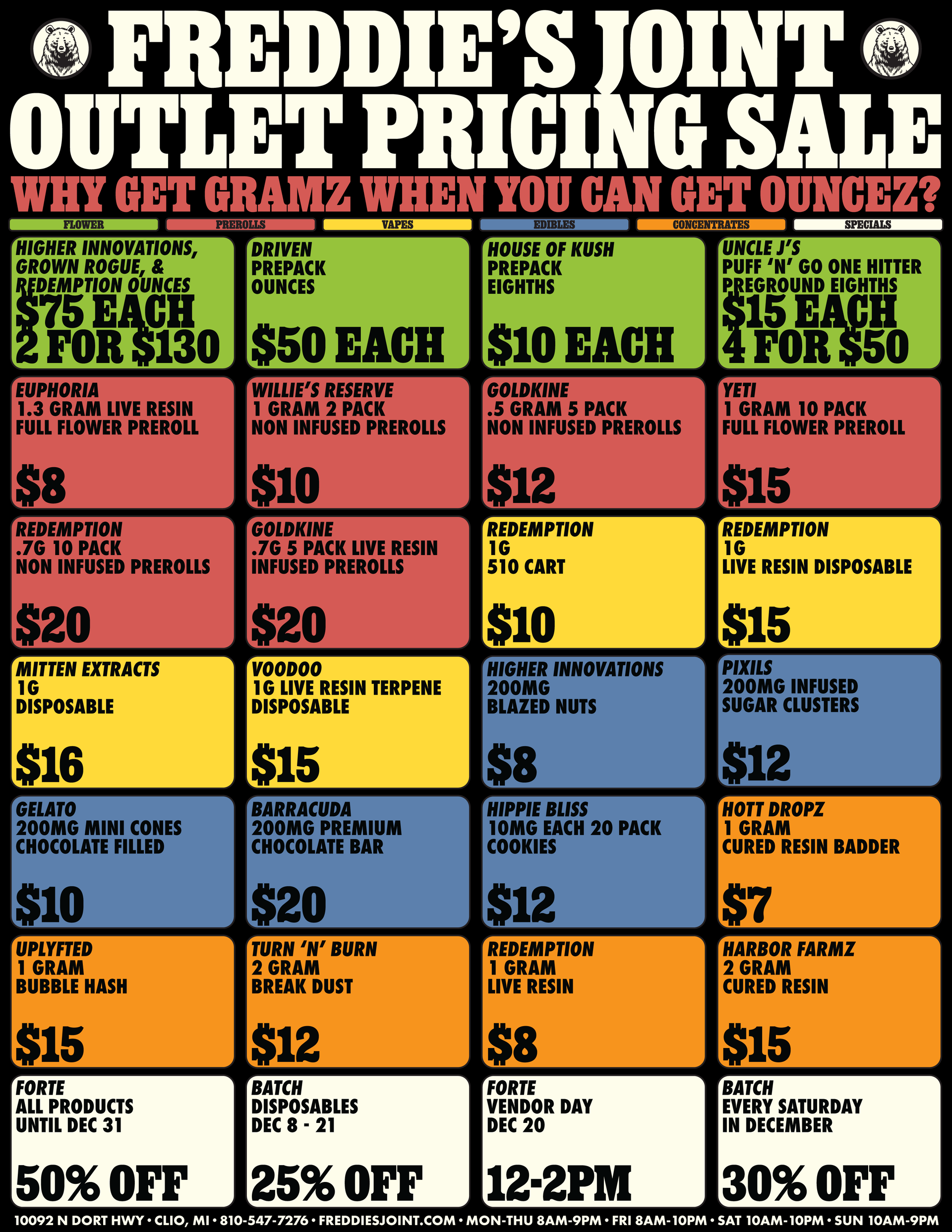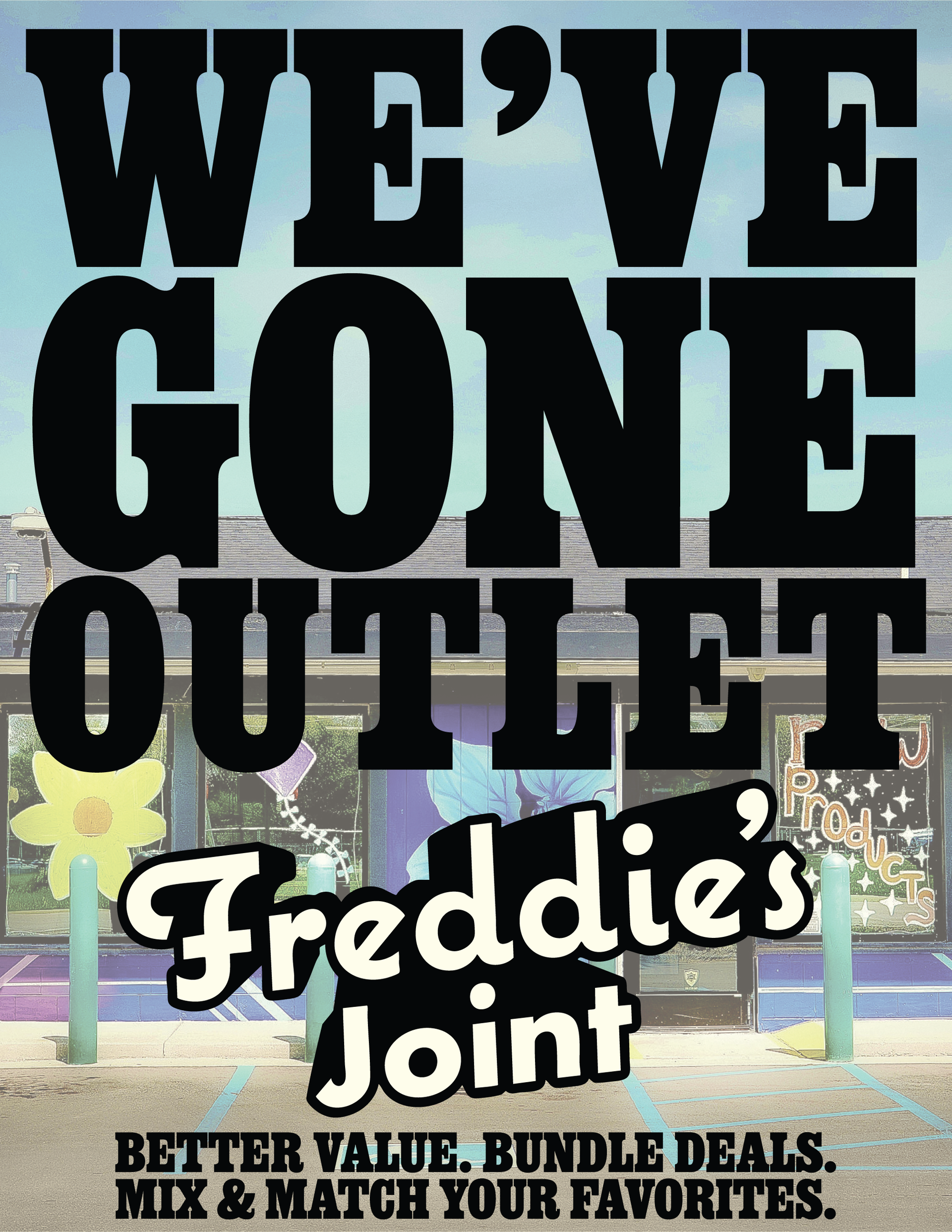Freddie's Joint is a cannabis outlet with the lowest prices in town on a wide and competitively priced selection of top quality flower, prerolls, vapes, edibles, and more. We provide the best service, the best value, and the most passionate budtenders. When you walk into our joint, you’ll know that it’s not all about business here – it’s about the people. If you don't leave happy, we're not happy. Feel Good at