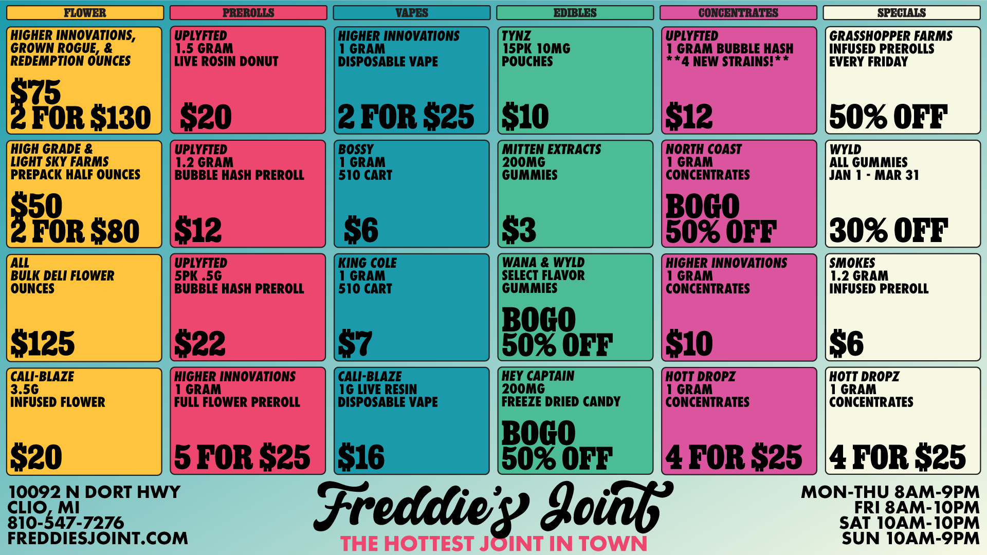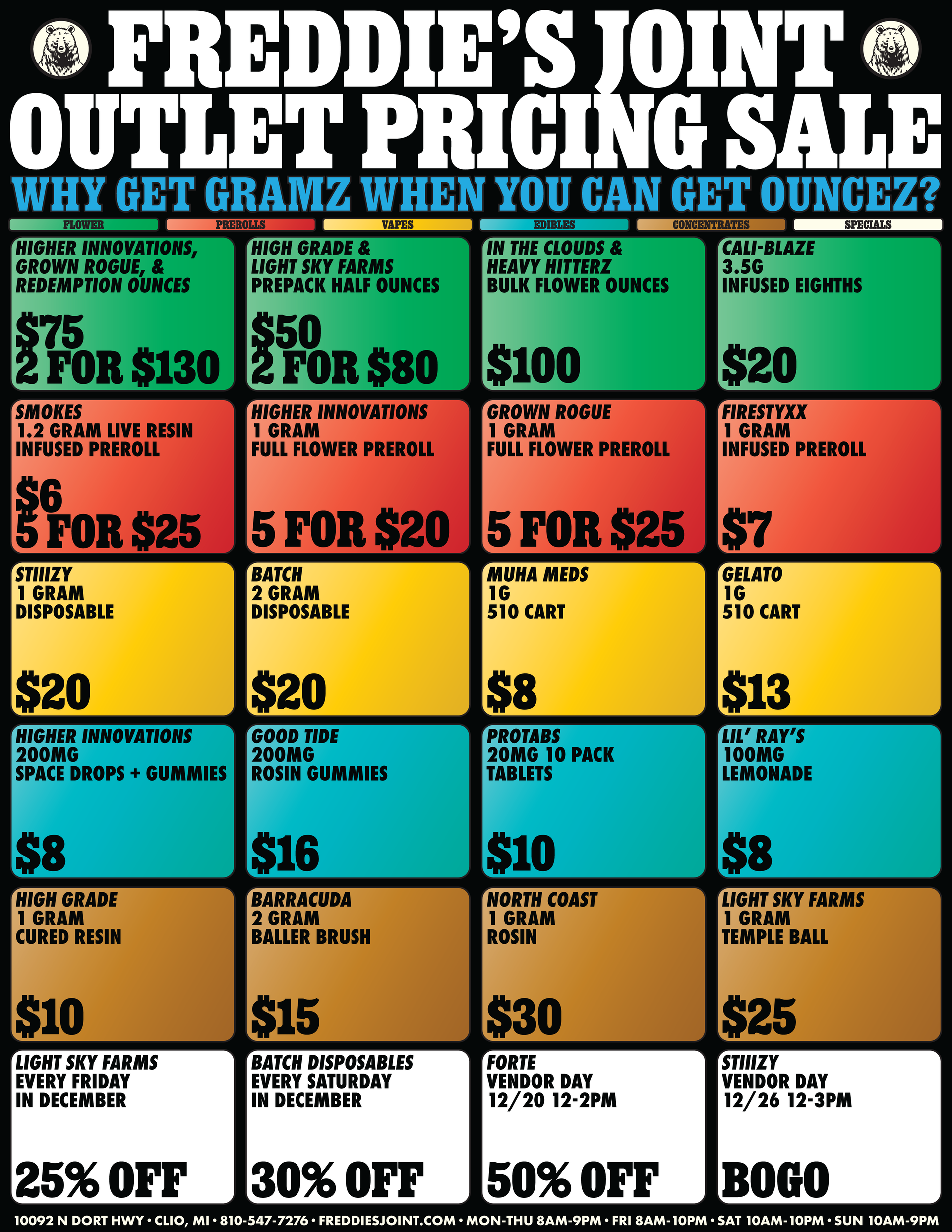 Freddie's Joint is a cannabis outlet with the lowest prices in town on a wide and competitively priced selection of top quality flower, prerolls, vapes, edibles, and more. We provide the best service, the best value, and the most passionate budtenders. When you walk into our joint, you’ll know that it’s not all about business here – it’s about the people. If you don't leave happy, we're not happy. Feel Good at