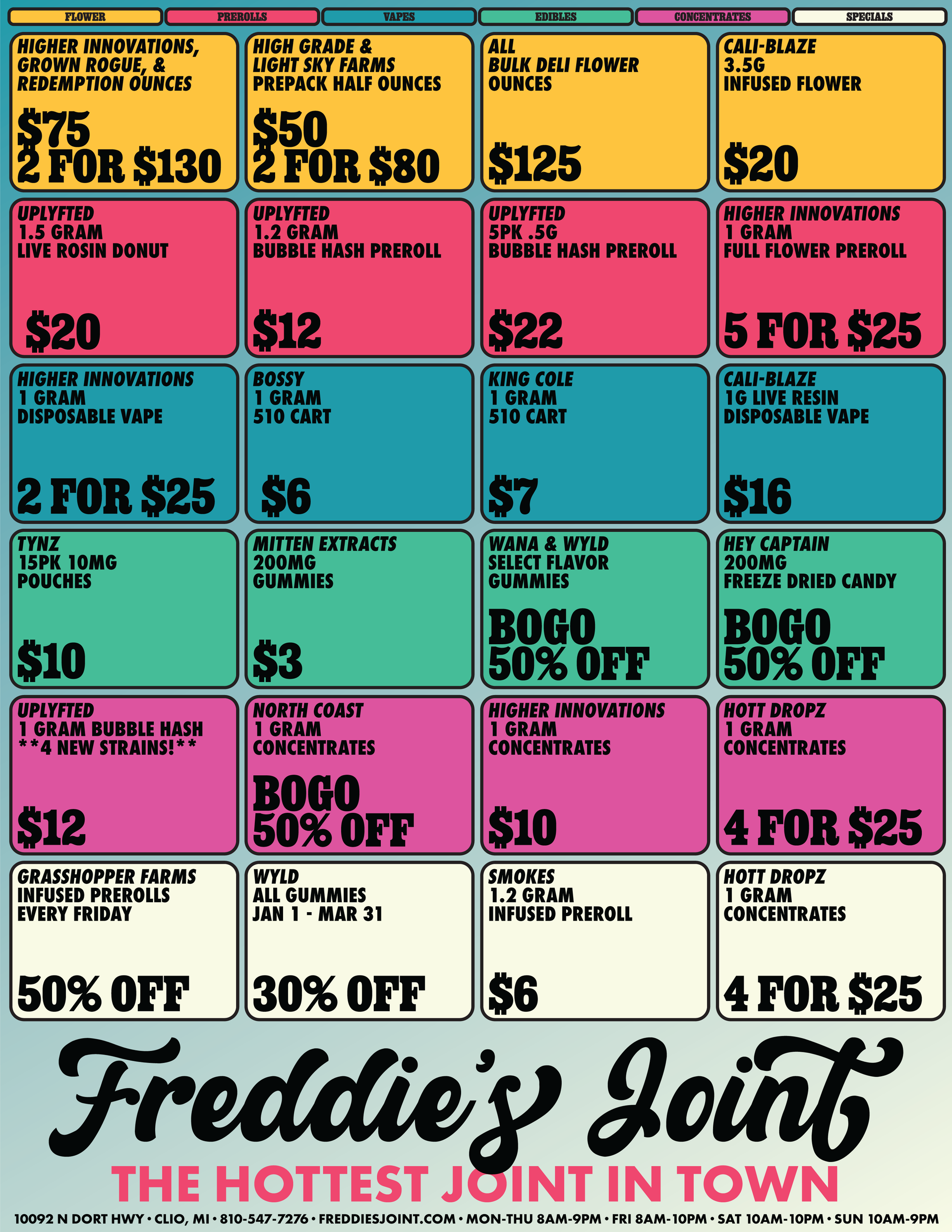 Freddie's Joint is a cannabis outlet with the lowest prices in town on a wide and competitively priced selection of top quality flower, prerolls, vapes, edibles, and more. We provide the best service, the best value, and the most passionate budtenders. When you walk into our joint, you’ll know that it’s not all about business here – it’s about the people. If you don't leave happy, we're not happy. Feel Good at